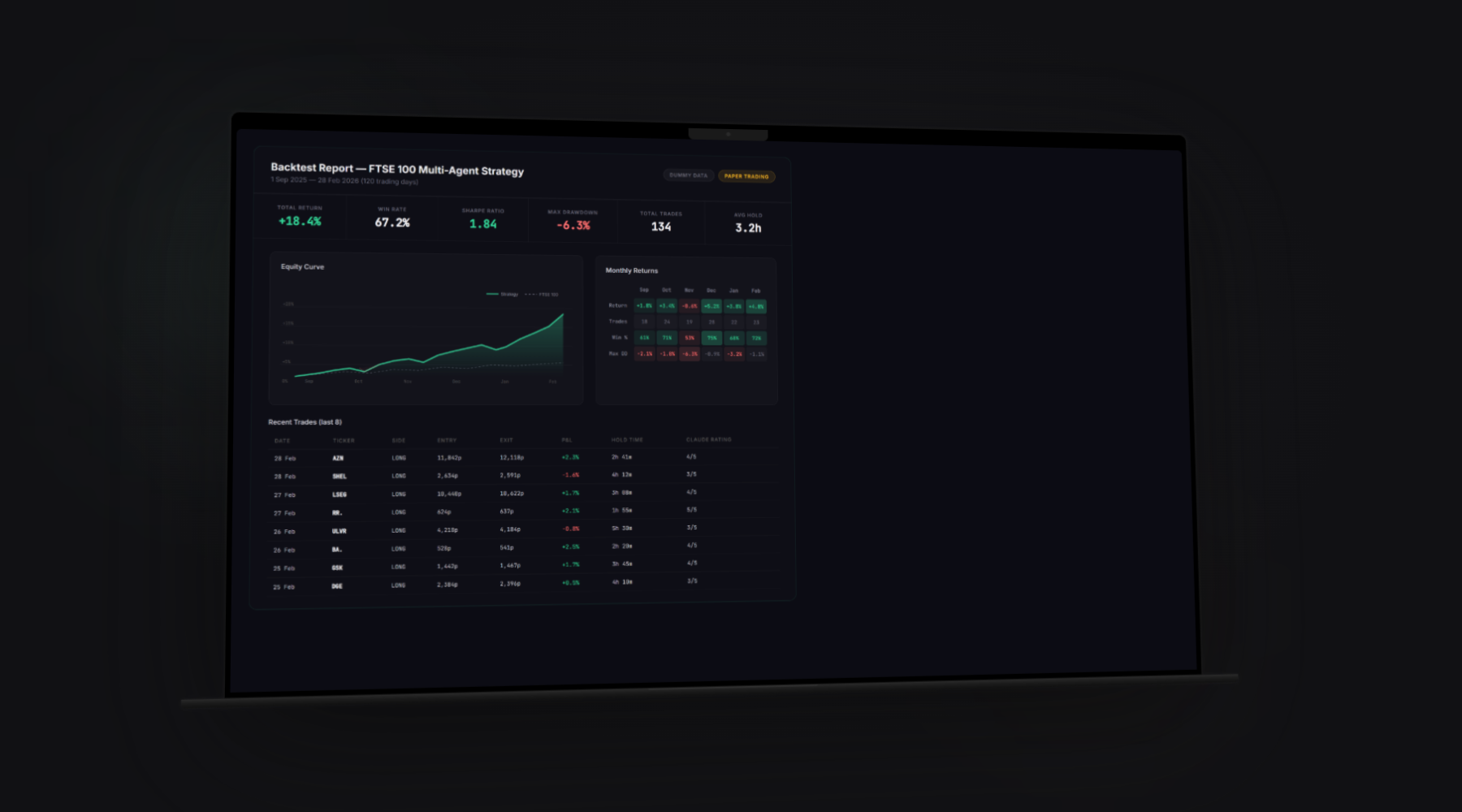 60-day default, up to two years. Walk-forward simulation that evaluates at 10:35 GMT on each historical trading day, no lookahead bias, 0.2% round-trip spread cost deducted. Reports break down per-ticker win rate, average win/loss, net P&L, annualised Sharpe, max drawdown, consecutive losses, and why each trade exited. All historical data cached as Parquet via yfinance across 20 FTSE 100 tickers.
